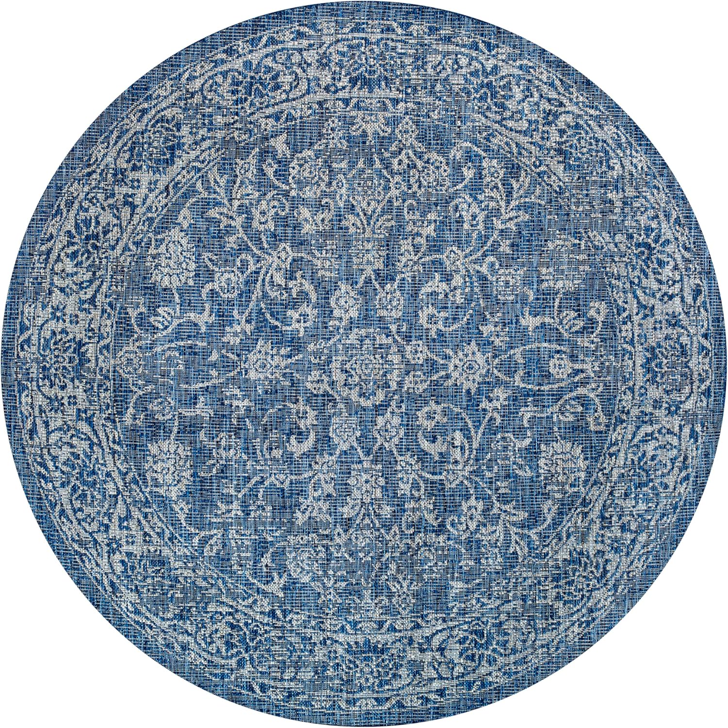 With a vine-and-border design inspired by rugs, our Boho-chic rug adds eclectic style to an outdoor porch or patio. Varied tones of blue and navy mingled with a light gray pattern give this rug a hand-woven, vintage vibe. The flatweave design is great for high-traffic spaces indoors too.