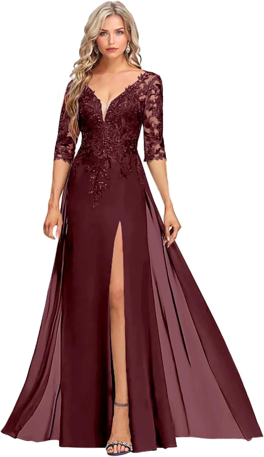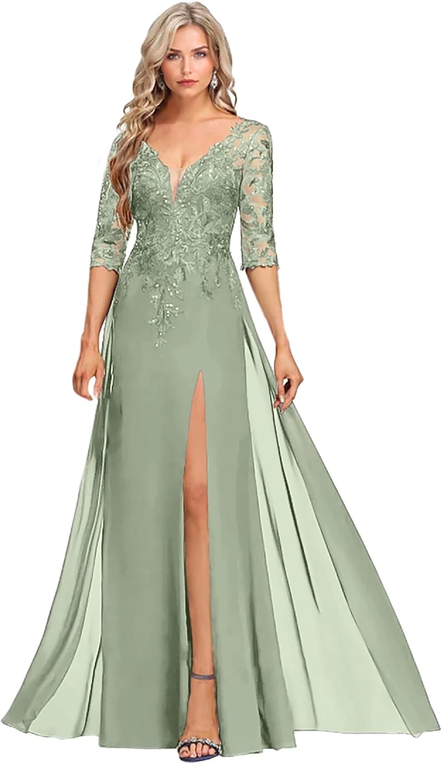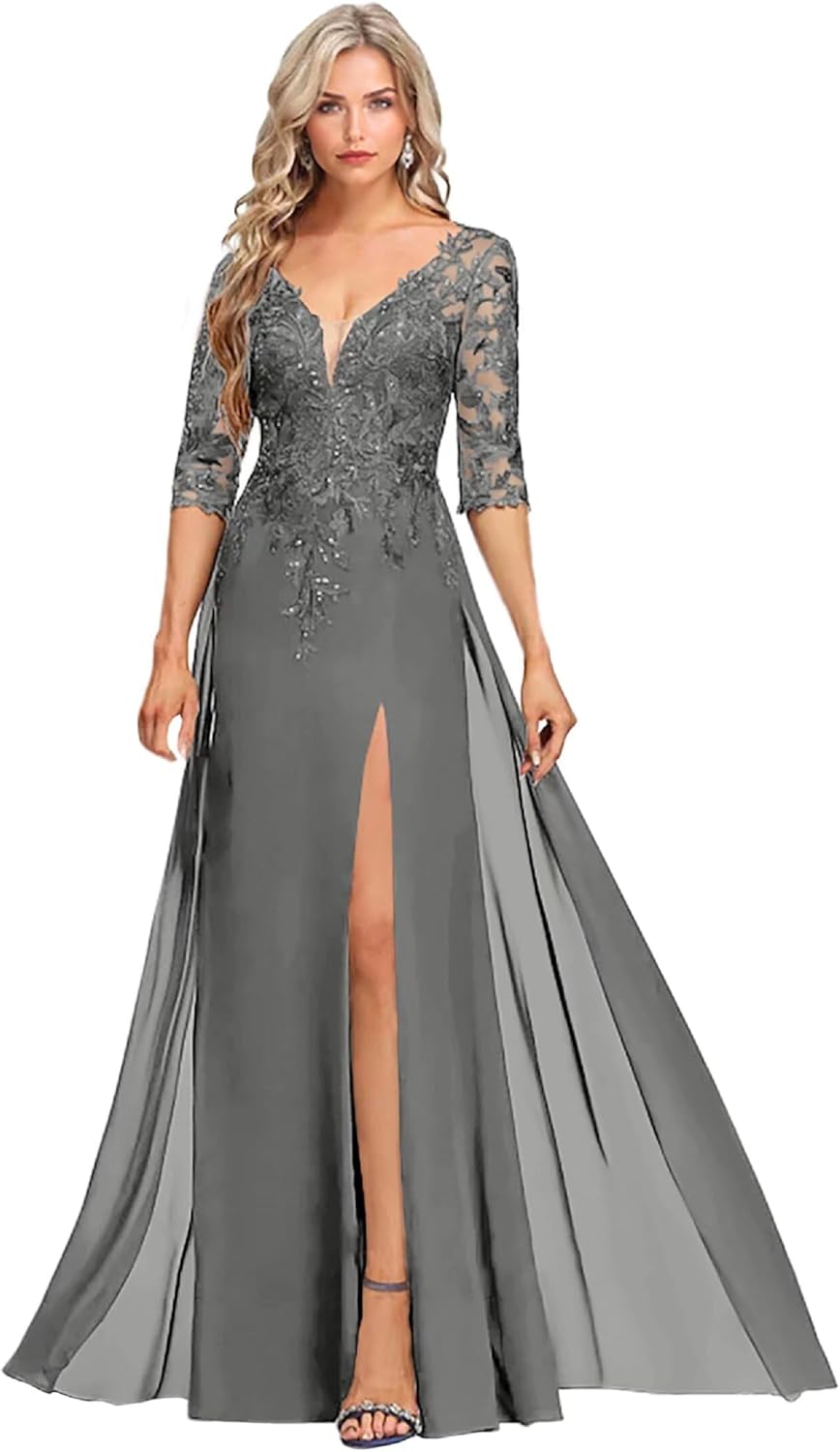 Sexy V Neck Chiffon Mother of the Bride Dresses for Women Sequins Lace Applique Formal Dress 3/4 Sleeve Mother of the Groom Dresses for Wedding A Line Wedding Guest Dresses for Women Evening Gowns with Split Formal Dresses for Women